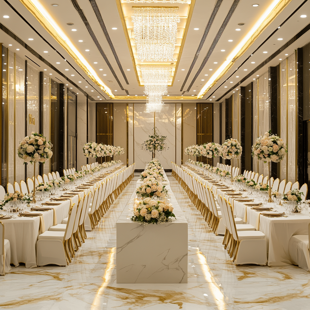Furniture communicates luxury long before dinner is served. Premium textures such as velvet, satin-like finishes, soft ivory tones, or warm metallic accents elevate the visual identity of the banquet. Chairs and tables frame every moment captured by cameras. A well-chosen seating style enhances the décor theme, complements the lighting, and reinforces the wedding’s character without demanding attention.