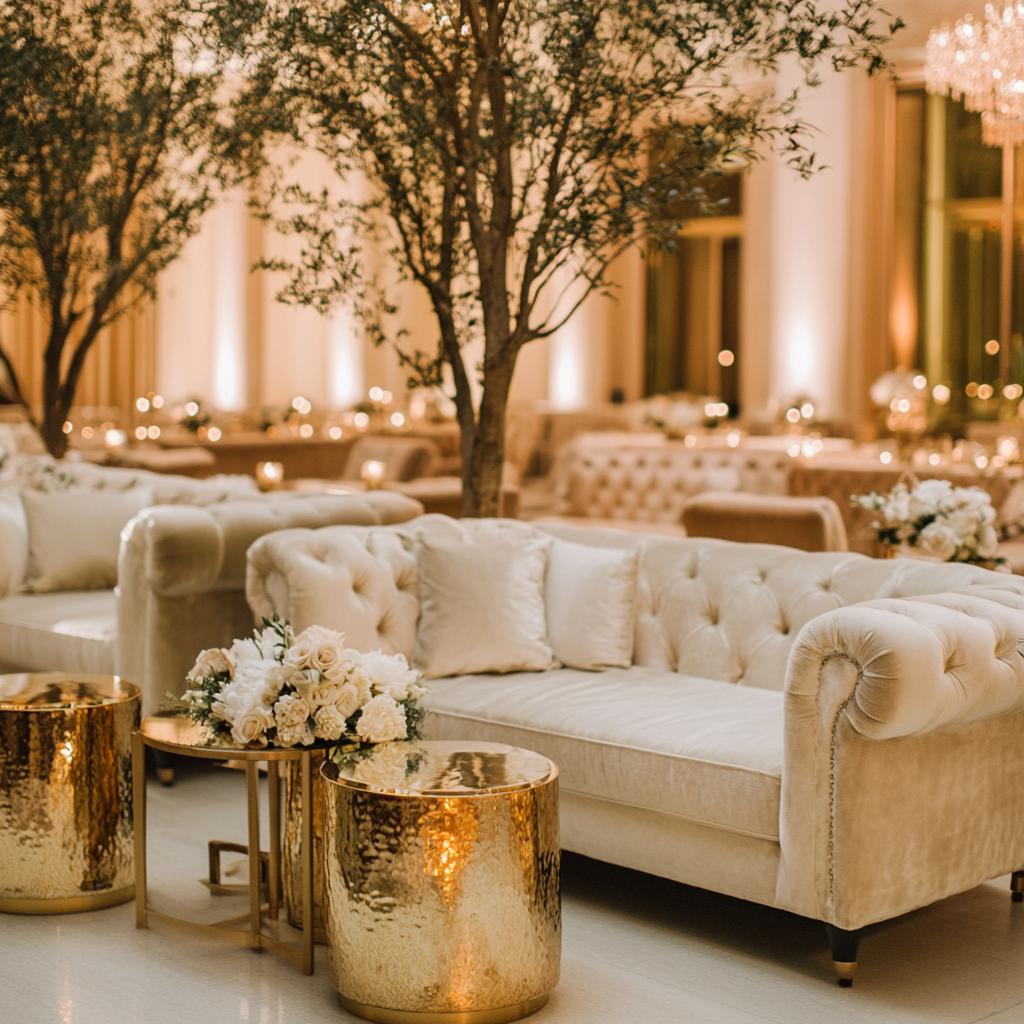 Adding a small sofa or ottoman corner is a growing trend in luxury wedding design. It keeps guests social before and after the banquet.