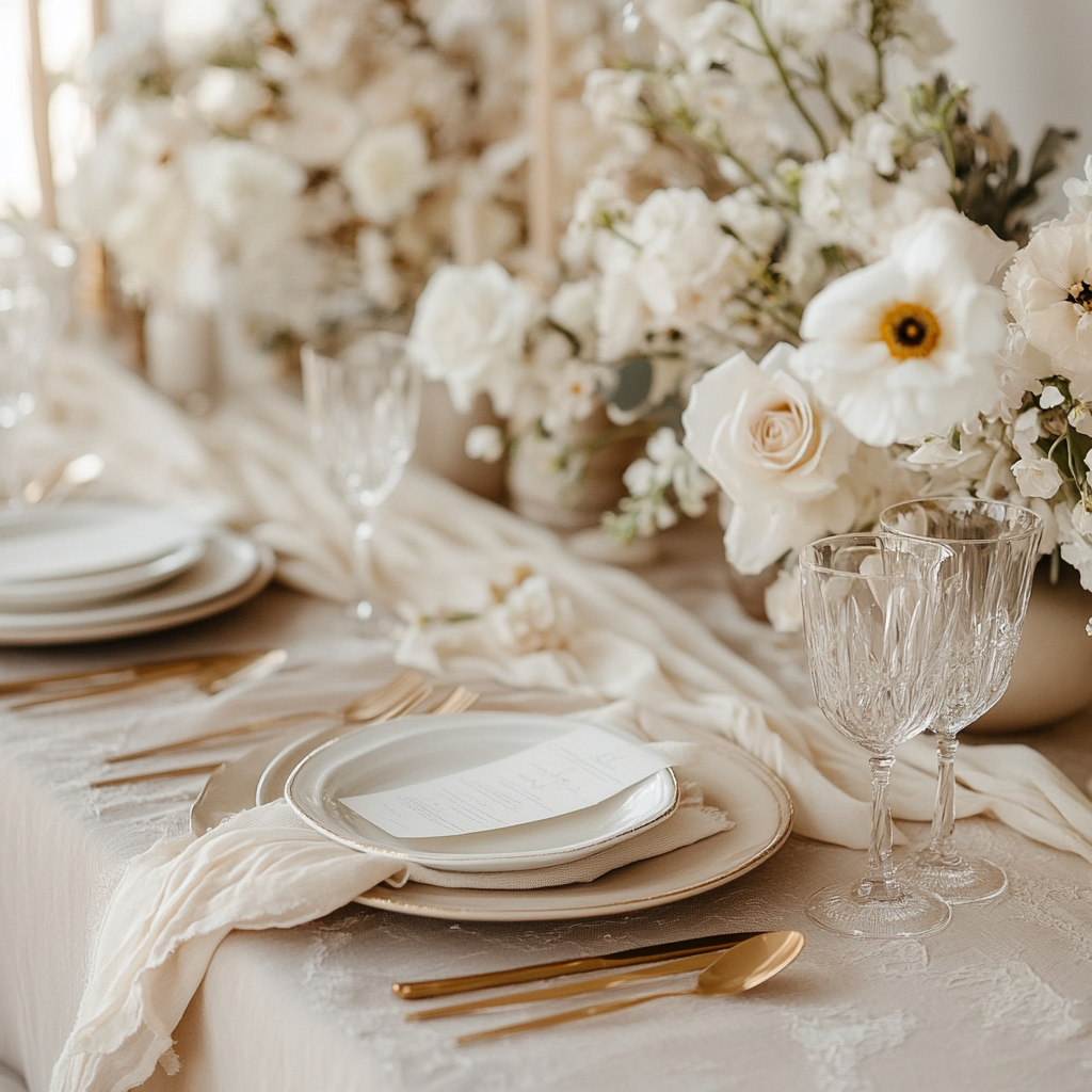 Color coordination ties all elements together. Neutral tones—white, ivory, sand, grey, or matte beige—create a calm foundation that can support any floral palette. Soft gold accents suit romantic weddings, while monochrome settings work well for modern venues. Outdoor weddings benefit from natural textures such as wood chargers, woven placements, or matte ceramics that blend with the environment.