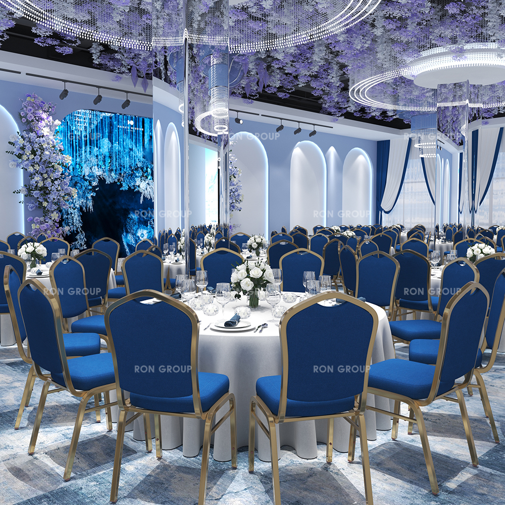 Ultimately, choosing commercial-grade, high-design furniture for an indoor venue is an investment in versatility. These royal blue and gold pieces are designed to stand out against the dramatic lighting and intricate wall moldings typical of luxury hotels and private estates. By focusing on structural elegance and ergonomic comfort, our furniture solutions ensure that the indoor banquet hall remains the pinnacle of wedding luxury, providing a photogenic and prestigious environment that meets the rigorous demands of the modern, high-end wedding market.