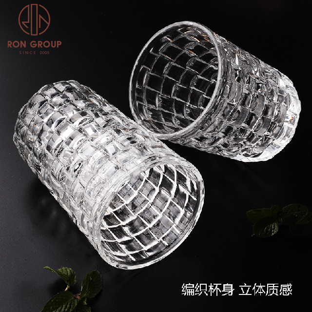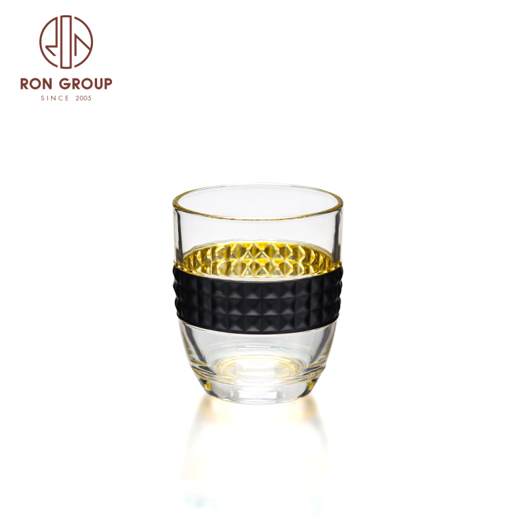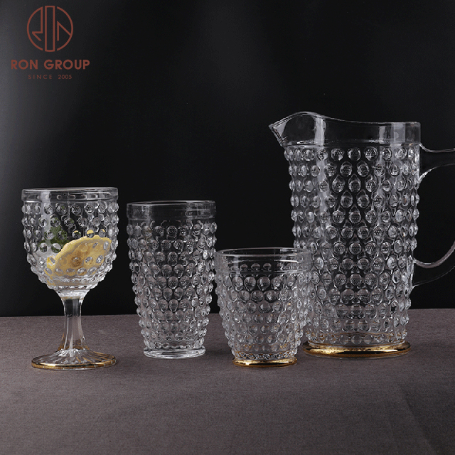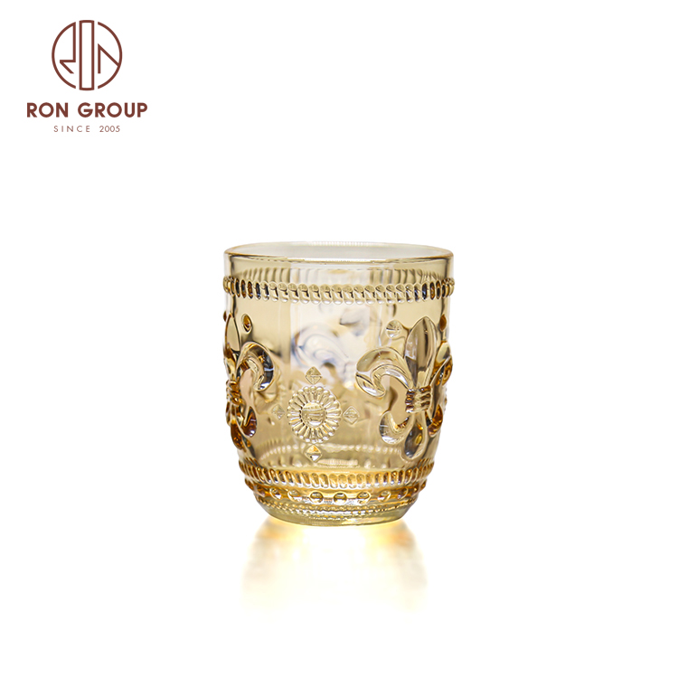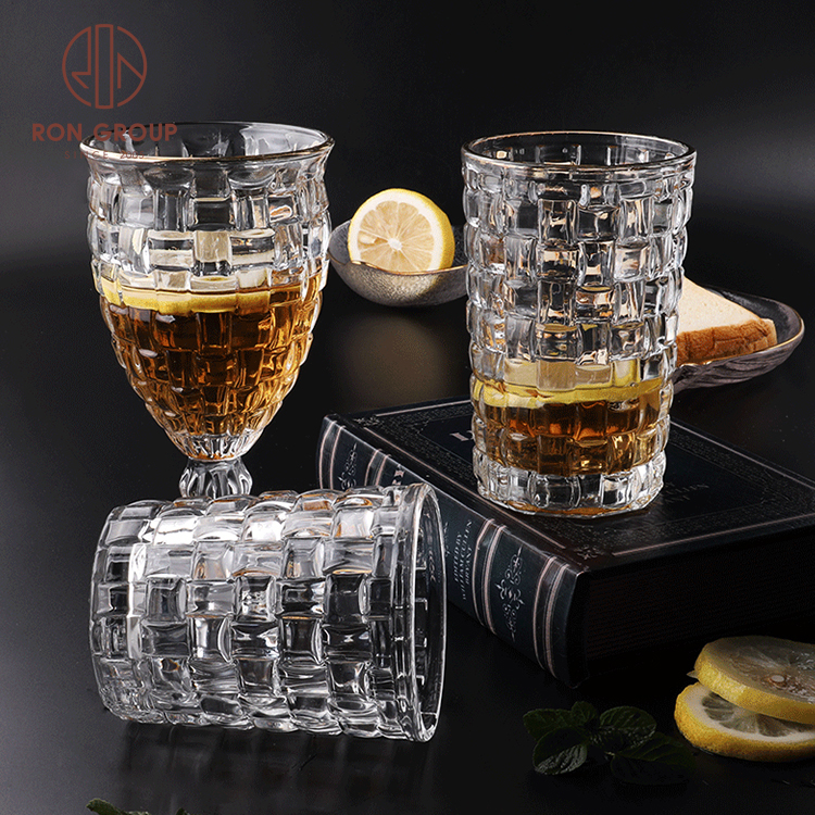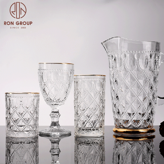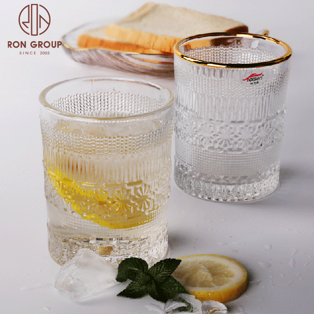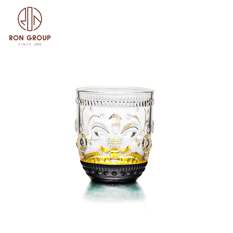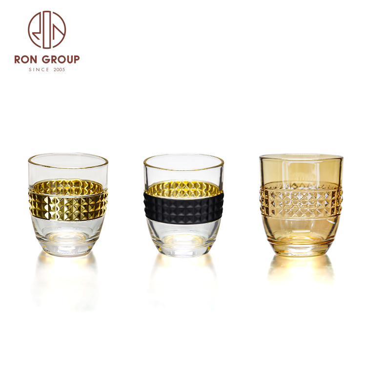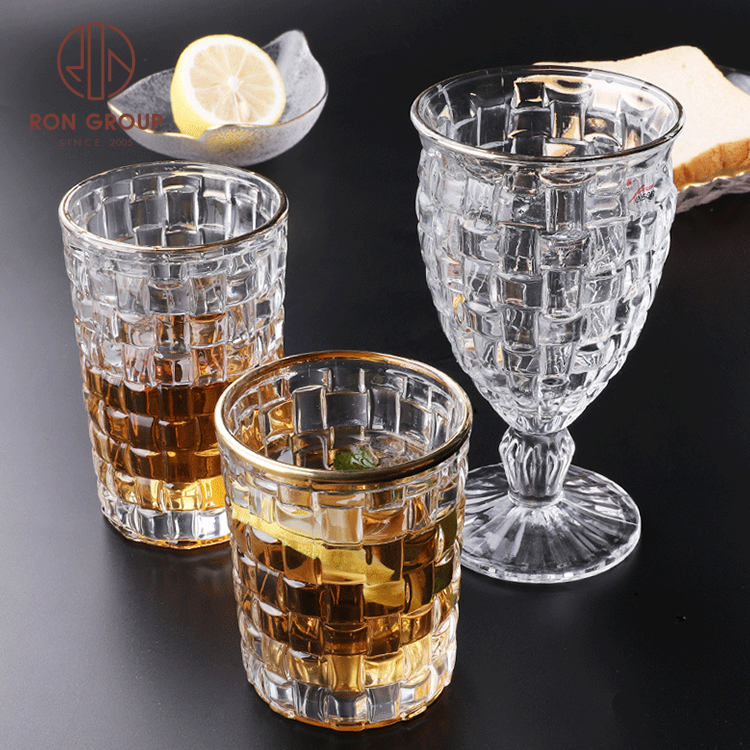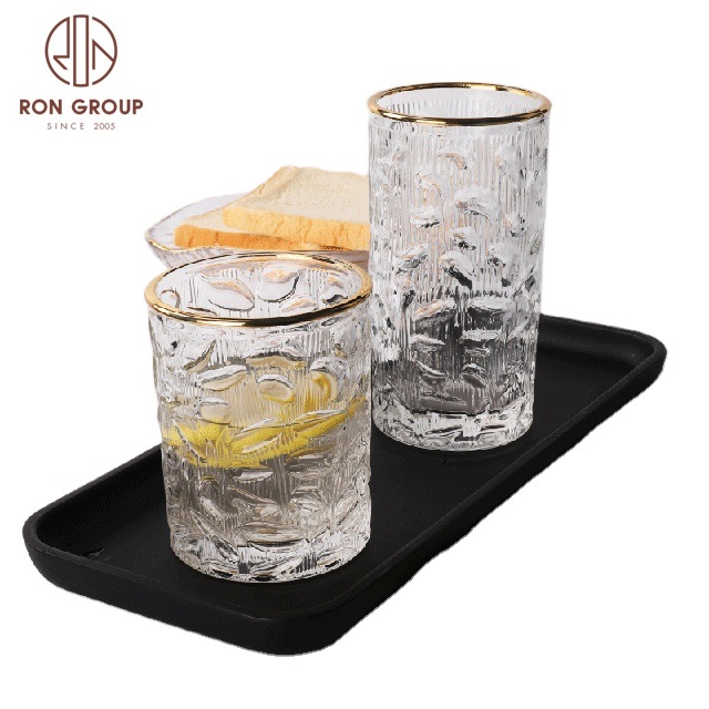 Luxury Gold Rim Embossed Stemless Glass Cups for Weddings, Hotels & Nightclub Drink Service