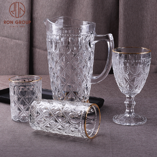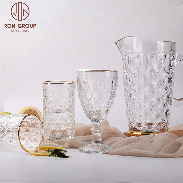 Embossed Vintage Glassware with Gold Rim — Lead-Free Wine, Coffee & Tea Goblets for Weddings