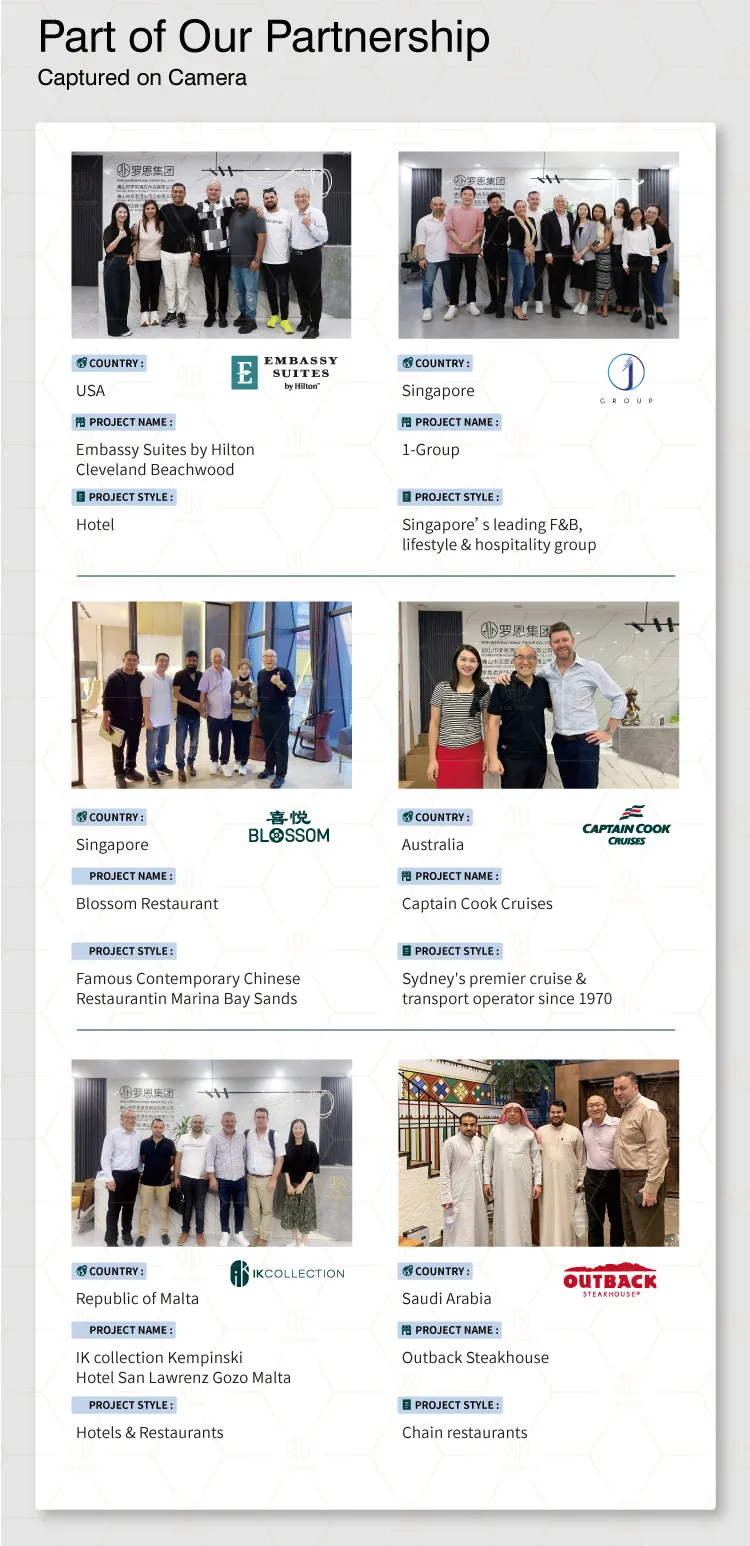 Ron Group is a multinational corporation specializing in the catering and hospitality industry, with over two decades of experience serving world-renowned brands including Outback Steakhouse, Chili's Grill & Bar, Burger King, Fuddruckers, etc. We provide comprehensive solutions encompassing high-quality product supply, professional layout design, operational management consulting, and reliable global logistics services to hospitality businesses worldwide. Our extensive expertise and end-to-end service capabilities enable us to deliver exceptional value to partners across the industry.