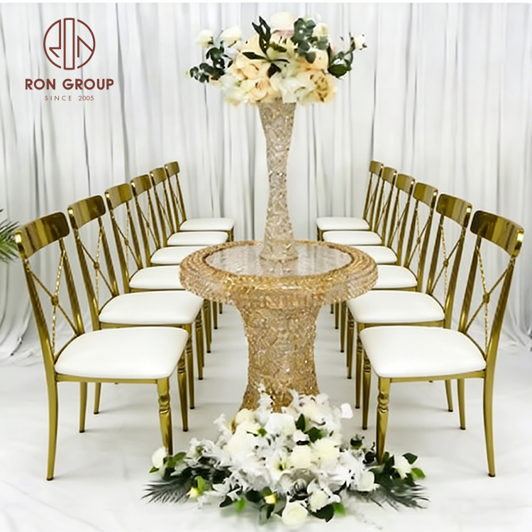 Comfortable Seating: Cross Back wedding chairs with leather seating for refined dining experience.